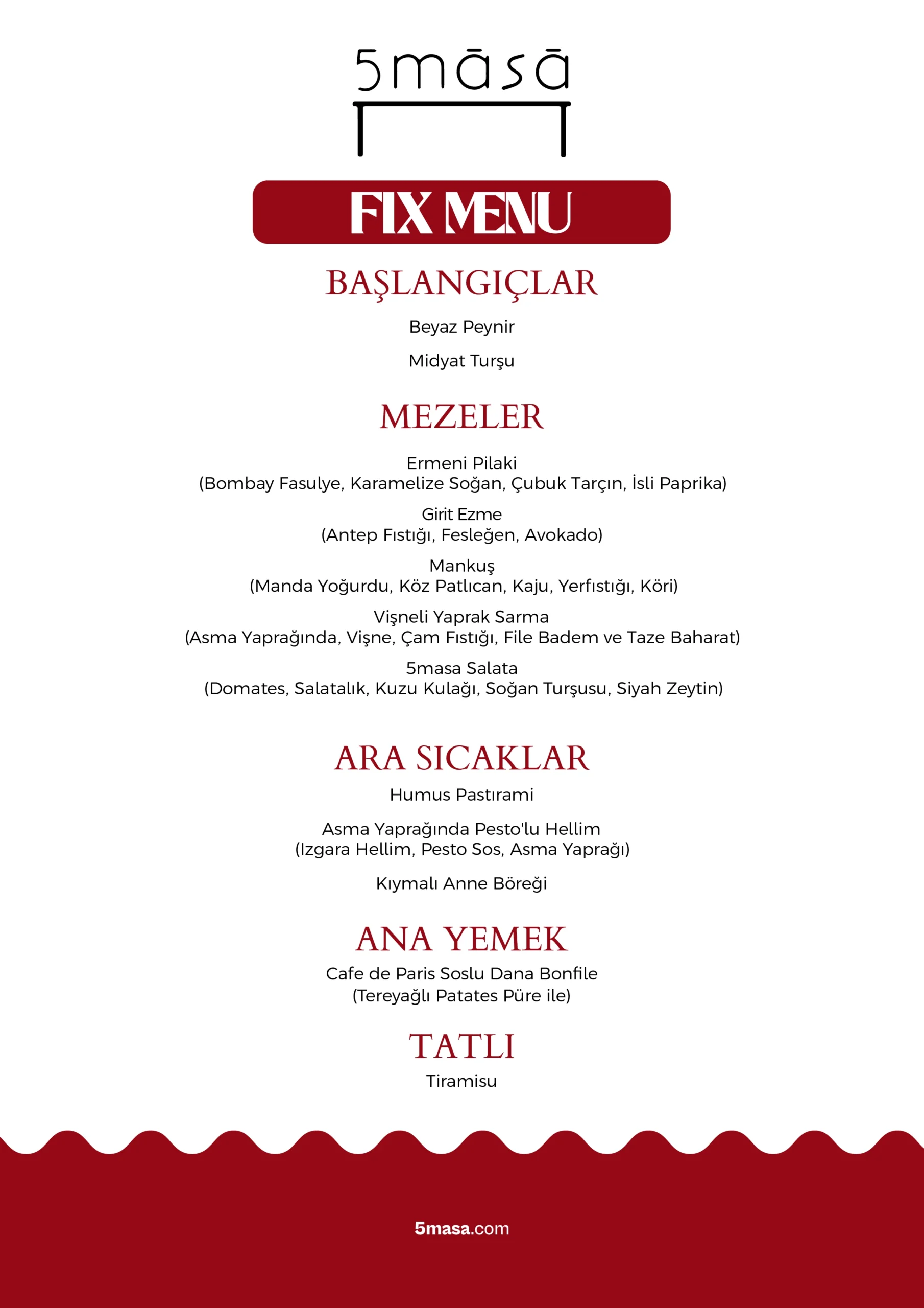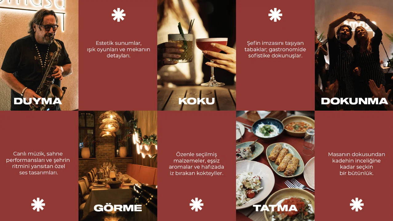 5masa, misafirlerine sadece lezzetli yemekler sunmanın ötesinde, bir sanat deneyimi yaşatmayı hedeflemektedir. Tüm ekibi, aşçısından garsonuna kadar müzikal bir arka planda birleşir. Her biri, sahne sanatları ve müzikle iç içe bir deneyim sunarak, misafirlerine unutulmaz anlar yaşatır Samimiyet ve içtenlik, 5masa’nın temel değerleri arasında yer almaktadır. Müzik ve yemek, burada sadece bir araya gelmekle kalmaz; aynı zamanda paylaşılır, hissedilir ve yaşanır.